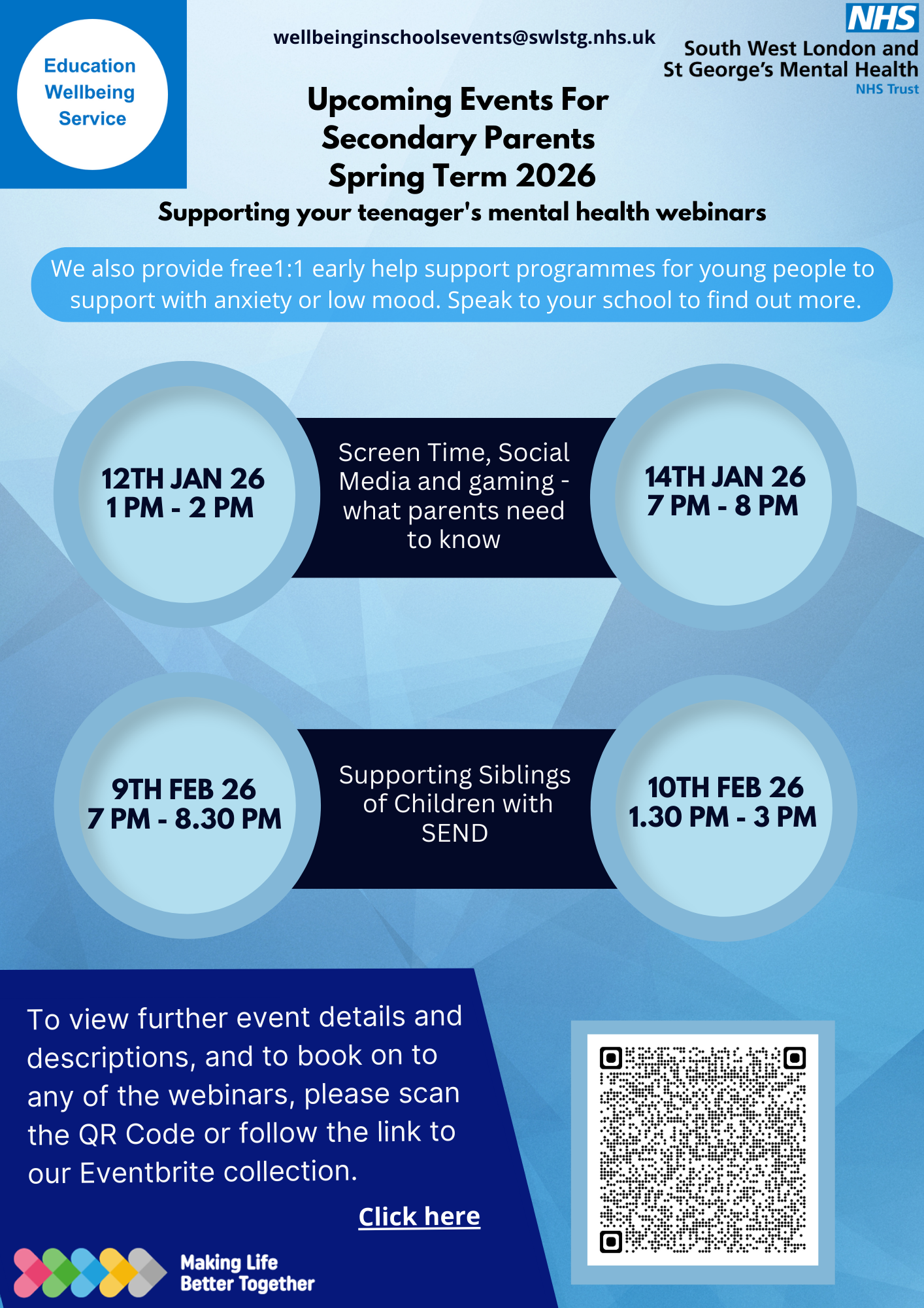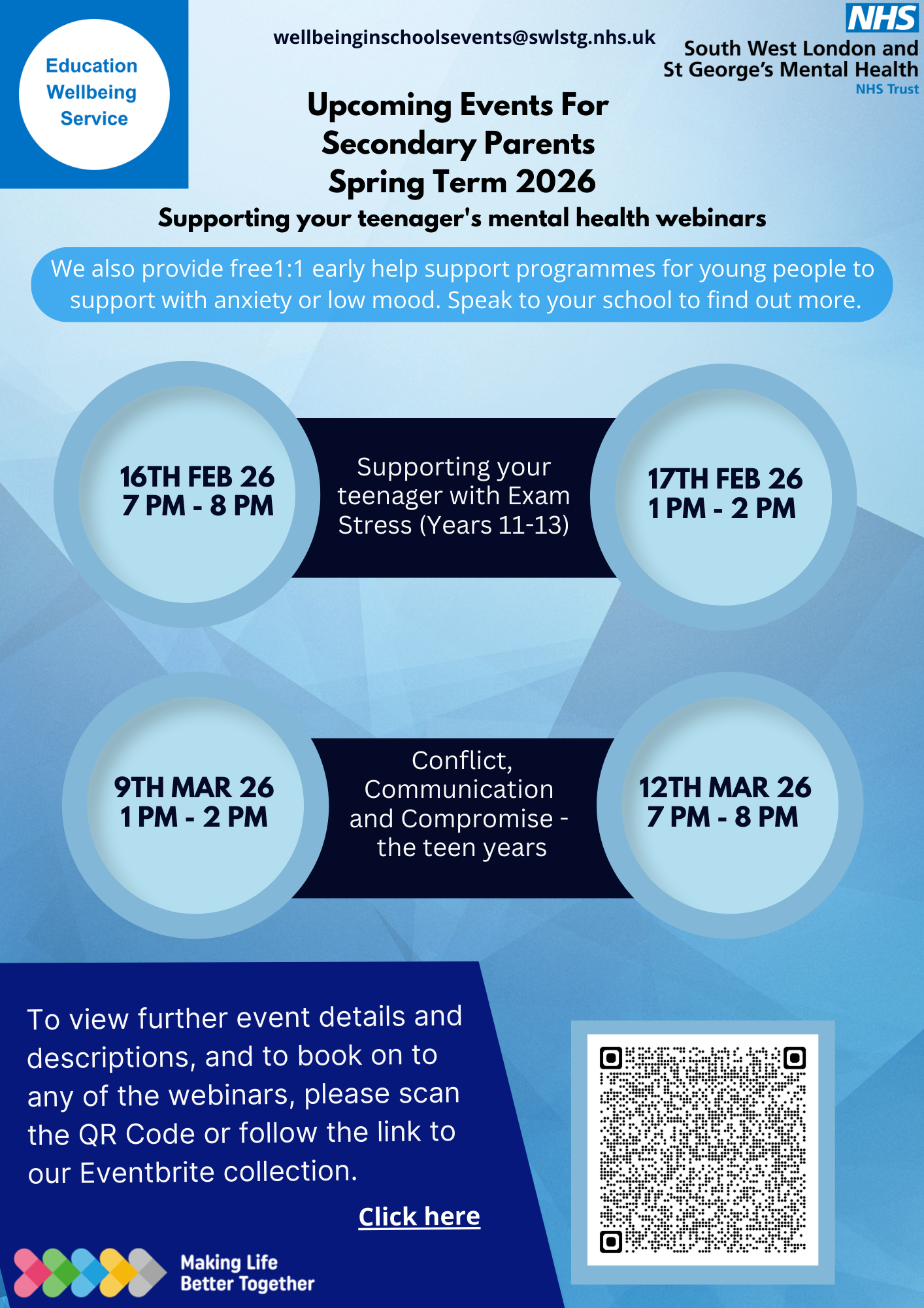 Education Well-being Service: Browze the series of helpful videos and webinars from the Education Well-being service, part of South West London and St George's Hospital NHS Mental Health Trust. The Service works with school communities across Wandsworth, Merton, Sutton and Richmond; supporting children, young people, parents/carers and educational staff to support the Mental Health and Well-being of our Children and Young People. Also, see below details of upcoming parent/carer webinars to support your teenager's mental heath.