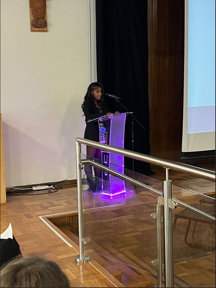 Sixth form and Year 11 students heard excellent speeches from our Year 12 applicants Maia H-M, Bolu, Sophie T, Emma S, Lucia S, Catherine B, Evangeline H-J, Catherine C, Beila E, Orla D, Dani W, and Emma C.