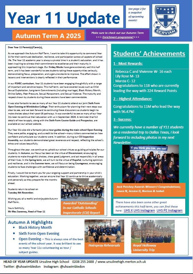 Please click below for the full Head of Year 11 Update Autumn A 2025 newsletter.