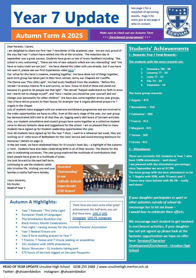 Please click below for the full Head of Year 7 Update Autumn A 2025 newsletter.