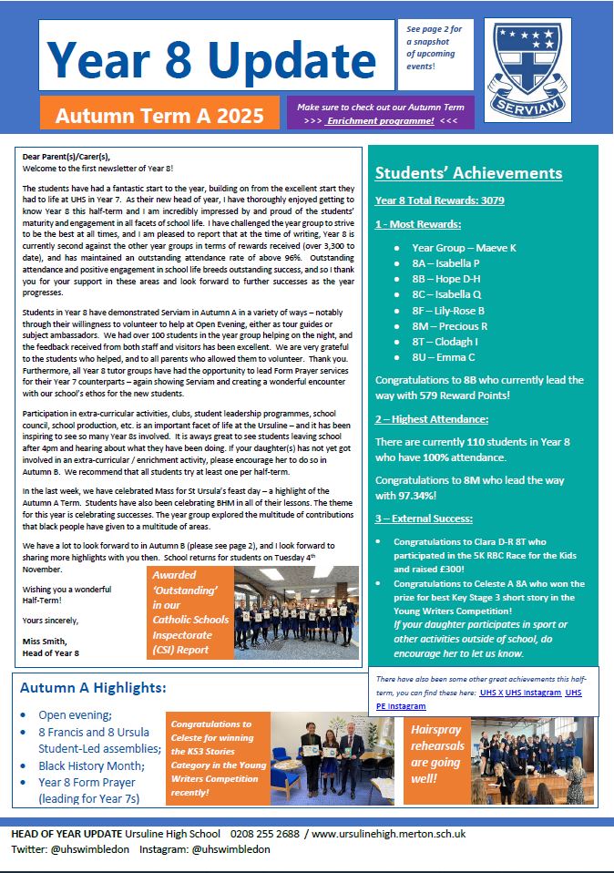 Please click below for the full Head of Year 8 Update Autumn A 2025 newsletter.
