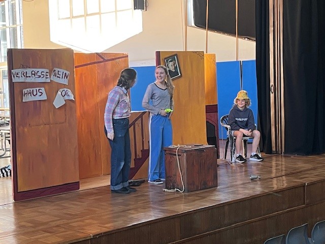 The play was about two friends, who find an old house. One girl starts seeing lots of creepy, mysterious things, but her friend doesn’t believe her. A policeman comes to the house and warns the girls that there is an escaped criminal on the loose, so they need to stay in the house to be safe. They are cold and hungry, so they need some firewood to keep warm, so one girl goes off to cut wood for the fire. The other girl is left behind and she gets more and more scared with each creepy thing – a chair mysteriously moves, she keeps seeing a creepy man appear and disappear. She starts to think she is going mad. They asked for a volunteer and Isabel went on stage to join in the play. She answers their questions, about her name, her age and her family members - all in German.